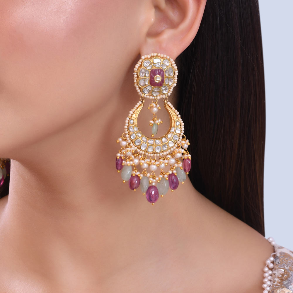These magnificent earrings exemplify a rich blend of traditional artistry and vibrant elegance. Each earring boasts a circular top stud, exquisitely detailed with small pearls encircling a central, faceted ruby-hued stone set in classic Kundan style, further enhanced by surrounding polki diamonds. Dangling beneath are an array of captivating teardrop-shaped beads in shades of plum and a softer, muted grey-green, interspersed with delicate pearl clusters.
