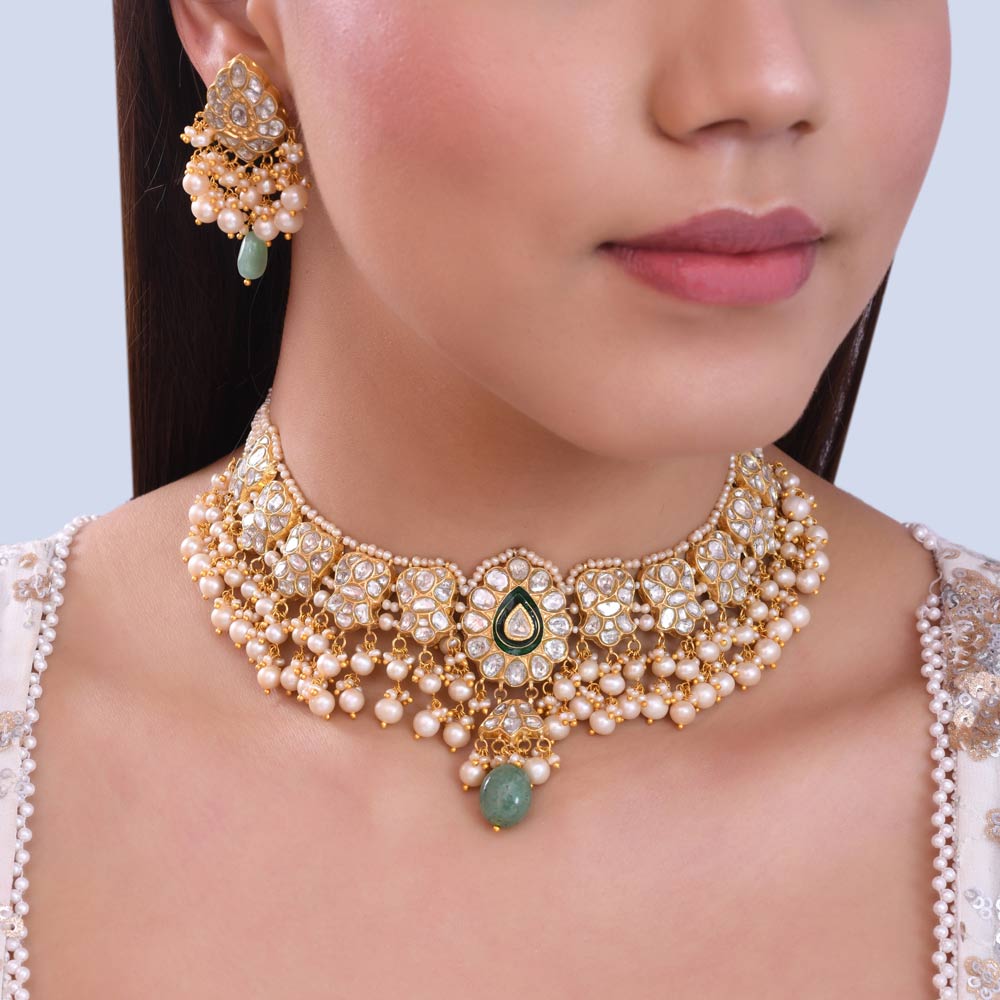 Ask For PriceExquisite 22 Karat Gold Polki Diamond & Pearl Choker Set with Emerald Accents