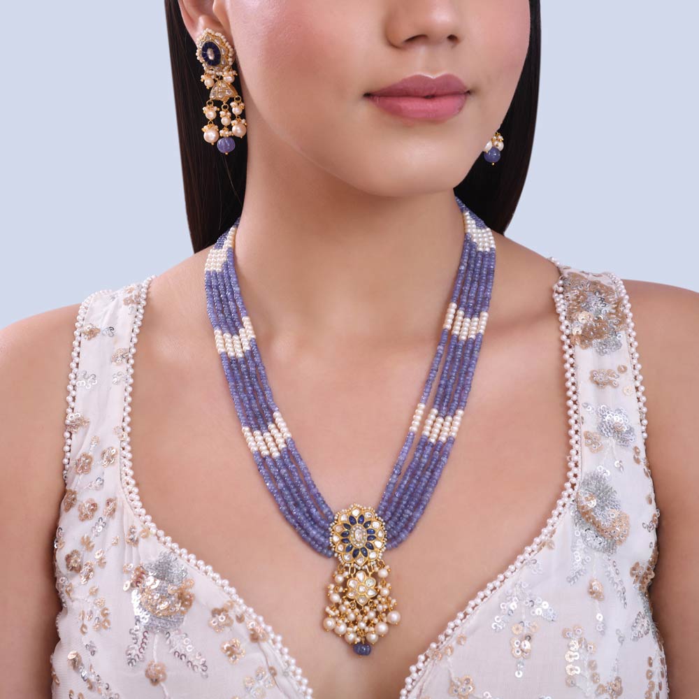 This breathtaking 22-karat gold necklace features a truly majestic pendant, serving as the opulent centerpiece. The pendant itself is a masterpiece of traditional Indian craftsmanship, showcasing intricate Kundan work enveloping a vibrant blue gemstone (likely sapphire or lapis lazuli) surrounded by smaller shimmering white stones and delicate gold detailing. The pendant is gracefully suspended from multiple strands of beautifully faceted lavender beads, interspersed with tiny white pearls, creating a harmonious blend of color and texture.
