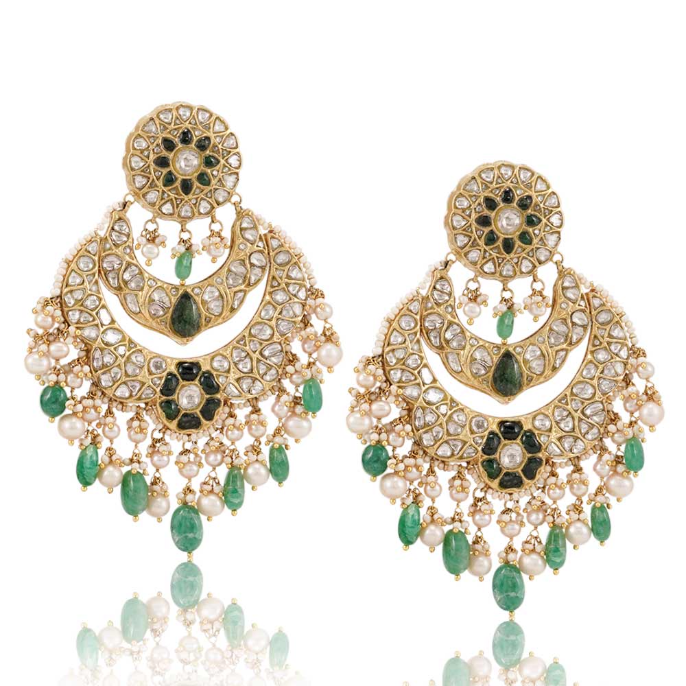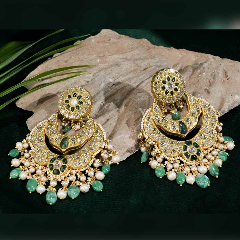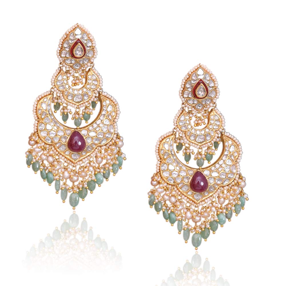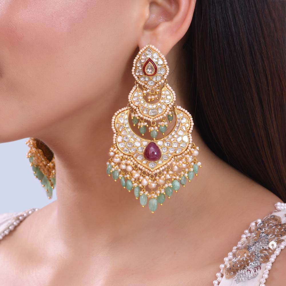 Step into elegance with these mesmerizing 22 Karat gold earrings, intricately designed with polki diamonds and finished with a cascade of ruby drop beads. The layered crescent silhouette, combined with delicate pearl detailing, creates a regal statement perfect for bridal looks and festive grandeur. These earrings are more than just accessories—they're timeless symbols of beauty, craftsmanship, and tradition.