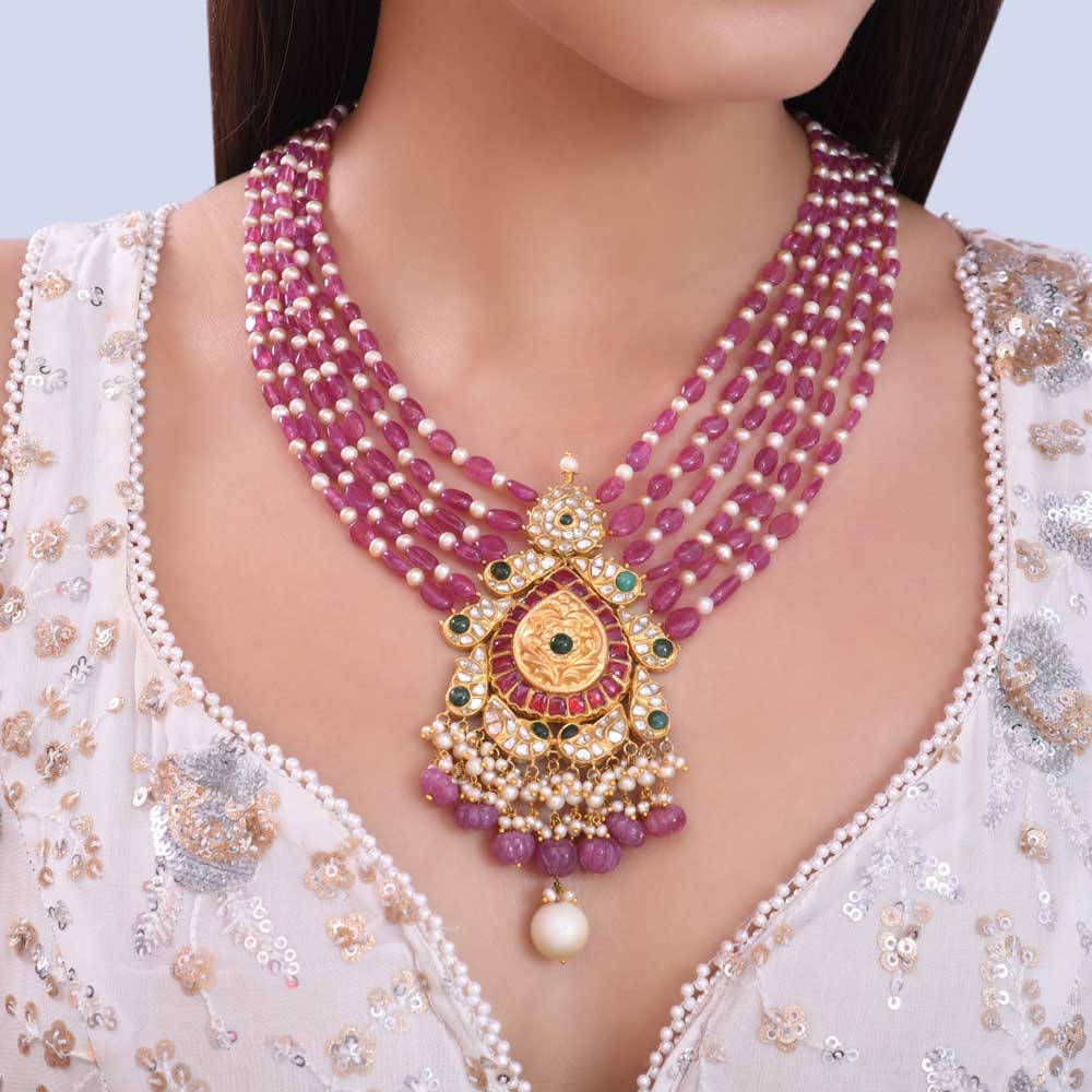 Indulge in the timeless beauty of heritage craftsmanship with this 22 Karat Gold Polki Diamond Pendant, gracefully suspended on multi-strand ruby and pearl beaded necklace. The grand pendant showcases a traditional teardrop design embedded with uncut Polki diamonds, accented by fine meenakari detailing, green enamel hints, and a captivating pearl drop that completes its regal charm. Perfect for weddings and grand celebrations, this statement piece embodies the luxurious elegance of Rajasthani royal jewelry, handcrafted to perfection.