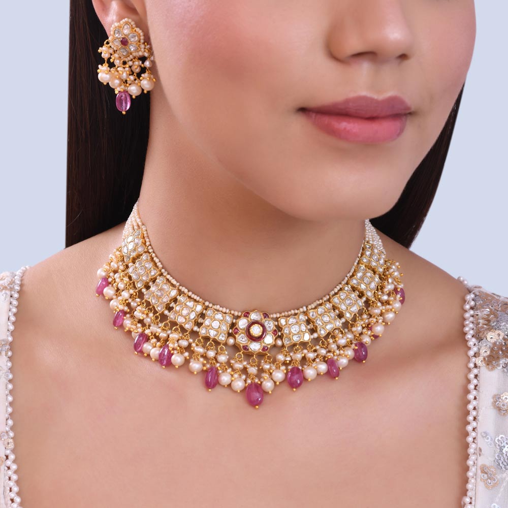₹173,478Regal 22 Karat Gold Polki Diamond & Pearl Choker Set with Ruby Drops