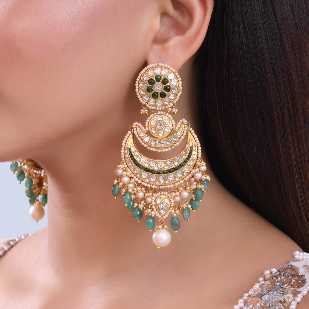 These exquisite earrings are a captivating display of traditional craftsmanship and luxurious design. Adorning the ear with their grand, multi-tiered structure, they feature an intricate arrangement of lustrous gold, delicate pearls, and vibrant emeralds. The top circular motif, embellished with a floral pattern of dark green stones, transitions gracefully into a crescent-shaped design, itself adorned with further emeralds and an array of pearls. Below, a cascade of smaller, tear-drop emeralds and spherical pearls creates a mesmerizing fringe, culminating in a single, prominent pearl drop
