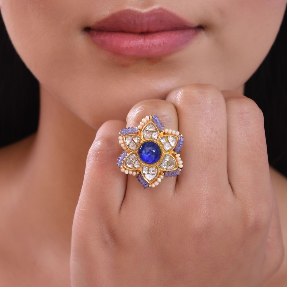 22 KARAT GOLD POLKI DIAMOND RING | DIAMOND RING | BRIDAL RING | LOTUS DESIGN RING | TRADITIONAL RING | BLUE GEMSTONE RING | TANZANITE STONE RING