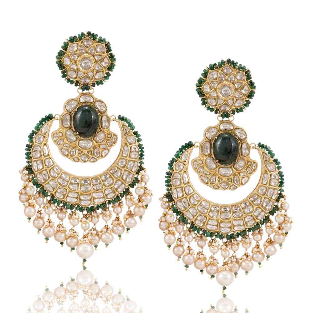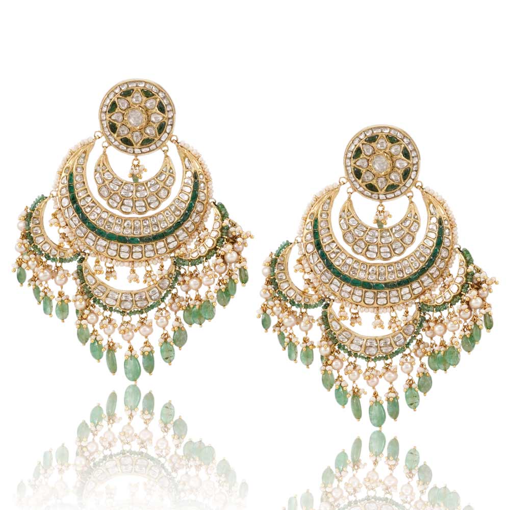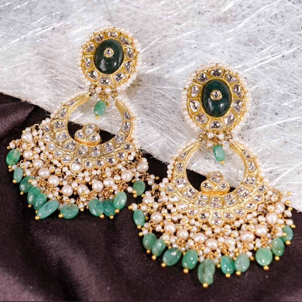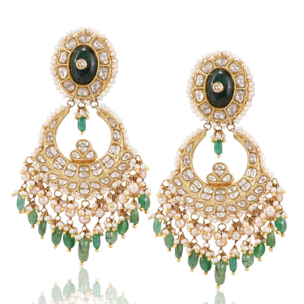 Elegance takes flight with these captivating 22-karat gold Polki diamond earrings. The classic chandbali design is elevated with the majestic beauty of uncut diamonds, each one meticulously arranged to capture and reflect light with remarkable sparkle. The earrings feature a stunning central emerald, its deep green hue offering a royal contrast that is both bold and sophisticated. Adorned with a halo of intricate gold work and finished with delicate dangles of pearls and emerald beads, these earrings showcase a perfect harmony of color and texture.