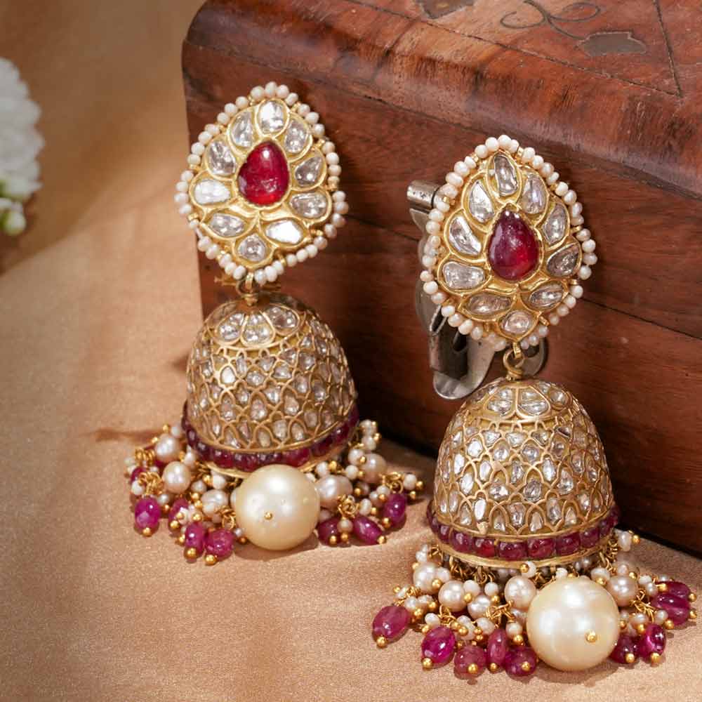 These stunning Kundan Jhumka earrings embody timeless craftsmanship and regal beauty, perfect for enhancing any traditional attire. Adorned with a bold ruby red stone at the center, surrounded by intricate polki Kundan work, each earring reflects the richness of Indian heritage.