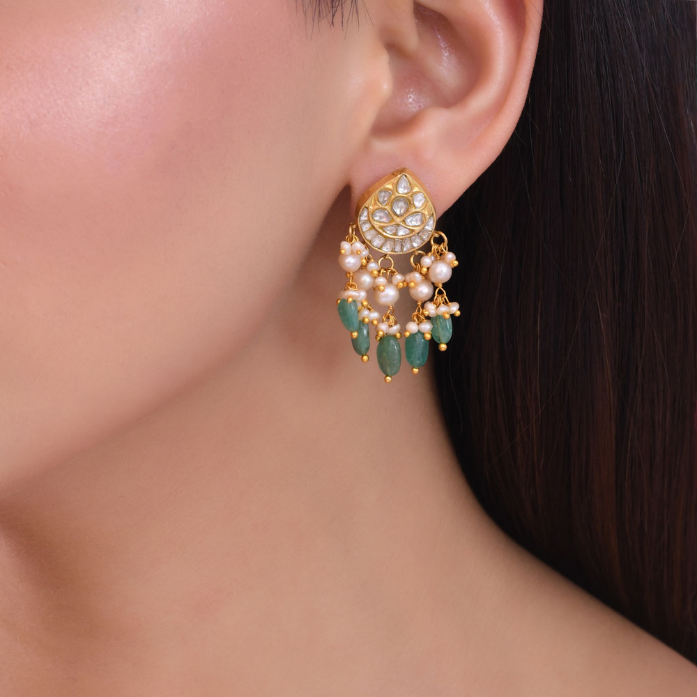 ₹55602Timeless Grace – 22 Karat Gold Polki Diamond Earrings with Pearl & Emerald Drops