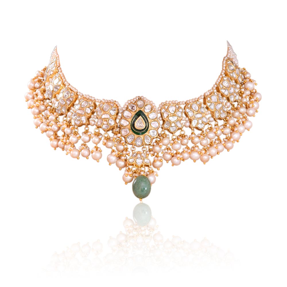 22 karat gold diamond necklace | floral kundan necklace | uncut diamond necklace | pearl and green bead necklace | Kundan drop Necklace | Bridal necklace
