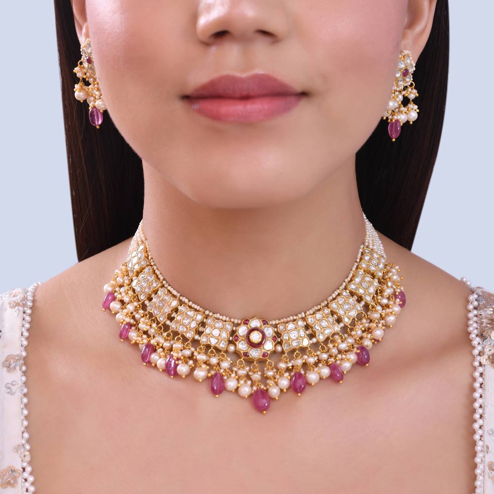 ₹173478Regal 22 Karat Gold Polki Diamond & Pearl Choker Set with Ruby Drops