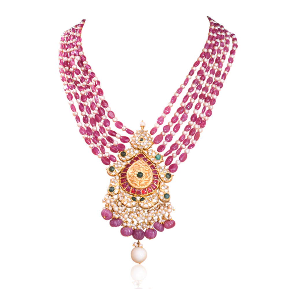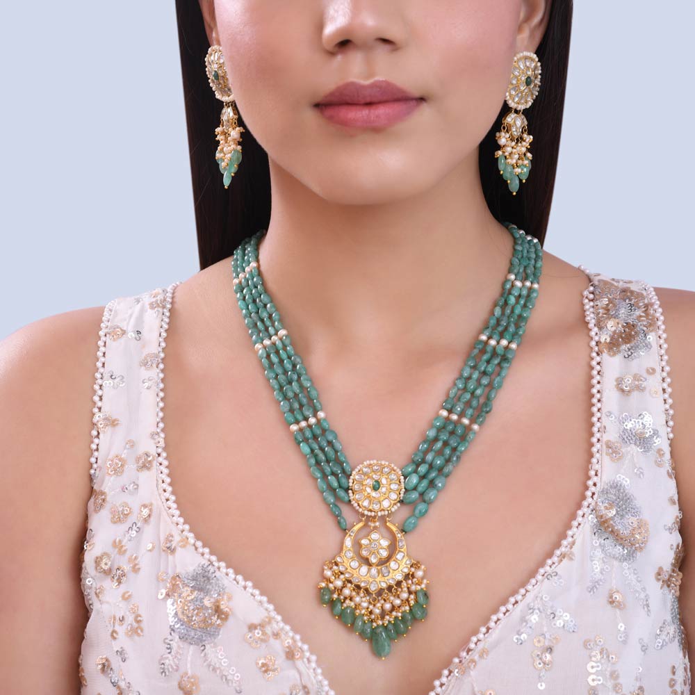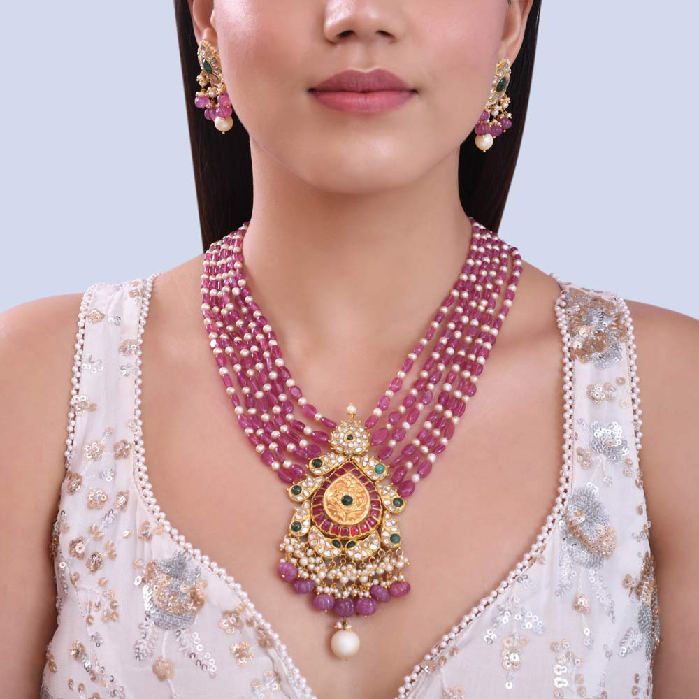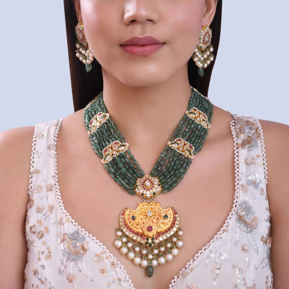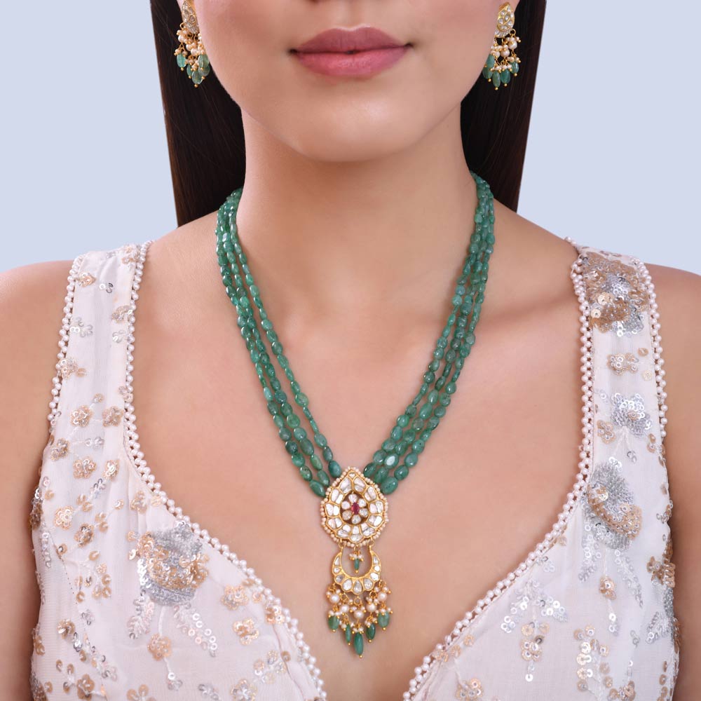 ₹13564122 karat gold Kundan Pendant Necklace | Ruby Green Beaded Jewelry | Multi-strand Gemstone Necklace | Traditional Indian Necklace | Festive Indian Jewelry