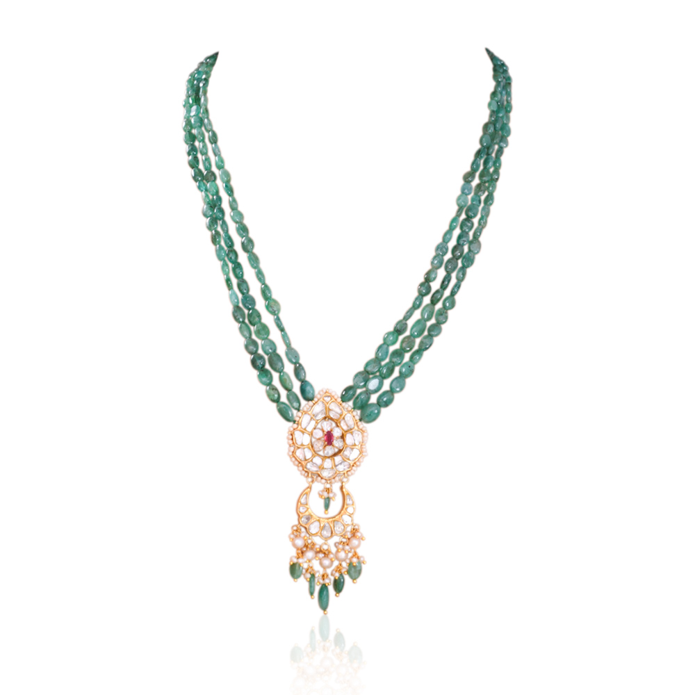 ₹10980322 KARAT GOLD NATURAL UNCUT SYNDICATE DIAMONDS LONG BEADS PENDANT WITH ZAMBIAN EMERALD AND PEARLS