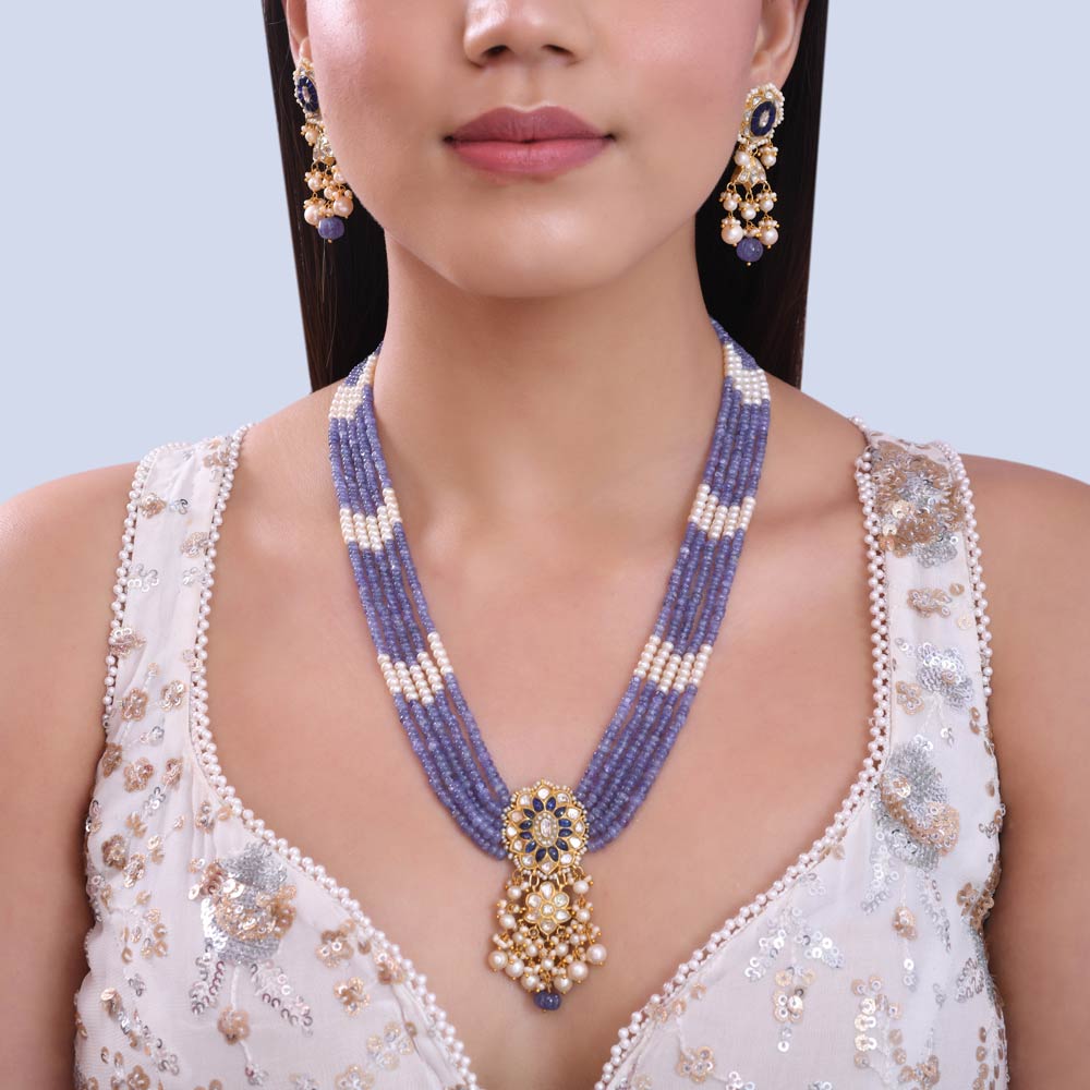 ₹11478022 karat gold Lavender Beaded Necklace | Pearl & Blue Stone Pendant | Elegant Ethnic Necklace | Ploki diamond necklace | Multi-strand Beads Necklace